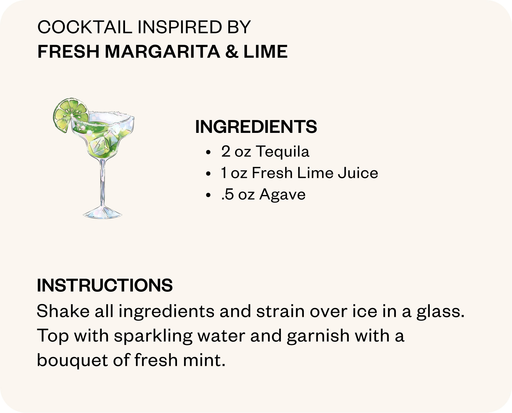 The sensation that inspired us: The margarita’s sparkling burst of lime and citrus, conveying a colorful and long-lasting feeling of freshness– like a beach party in a bottle!