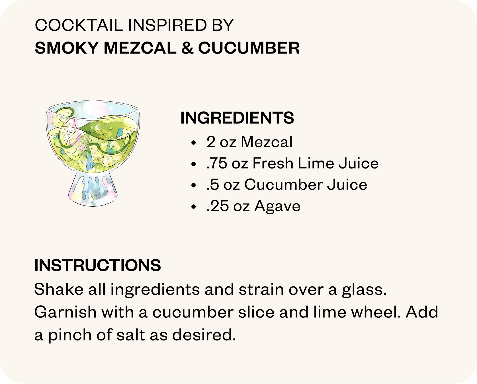 The sensation that inspired us: Mezcal’s naturally unique contrast between watery facets (agave), almost cucumber like, and smoky intoxicating dry tones. Ready for a one-way ticket to Oaxaca!