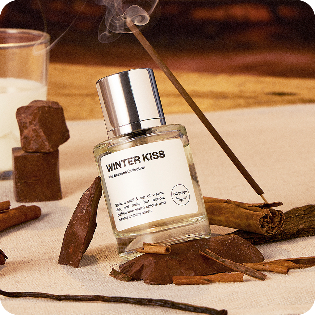 Winter Kiss celebrates the indulgence and gourmand sweetness of the winter season. This Dossier Originals scent opens with a warm, comforting embrace of milky accord, clove, nutmeg, and rum notes. The fragrance unfolds into a decadent, smoky, and rich heart of chocolate, incense, and cinnamon before unveiling a gourmand base of vanilla, vetiver, and creamy sandalwood. A tribute to winter’s great small pleasures, this smooth and mellow scent is enveloping, soothing, and addictive.