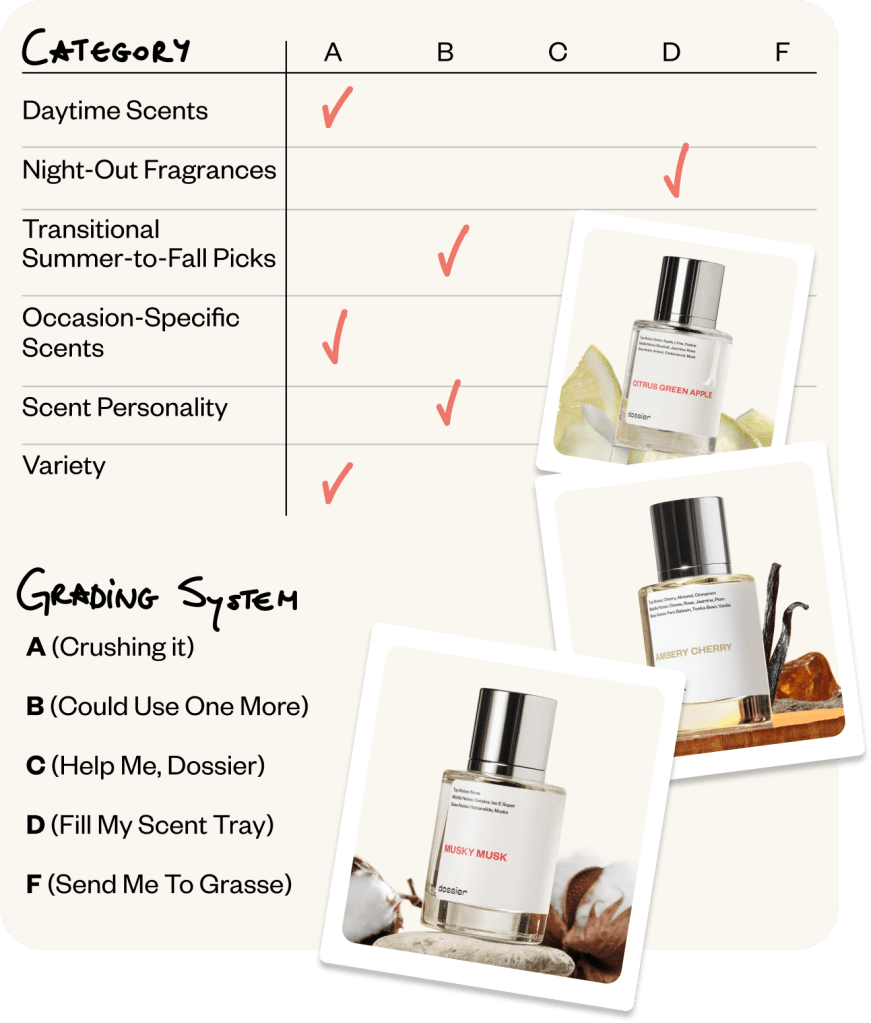 To make sure your fragrance collection is as versatile, expressive, and stylish as your first-day outfit, we put together your custom scent supply list: organized, seasonally curated, and packed with personality. Plus, we’ve included a little Fragrance Report Card so you can self-grade your scent situation. Let’s get into it, shall we?